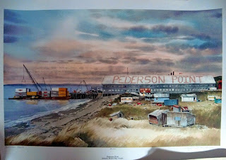 At 59, I don't really expect presents, but Harry surprised me, and so did my mom. Harry gave me a tube to open, saying that Jane (his wife and my sister-in-law) searched high and low for it and I was so thrilled to pull out this Nancy Stonington print that I have been wanting since I first saw it. This is the fish processing plant about a mile down the beach from us and this painting just about could have been made from my cabin. It will be great to be able to glance over to the same view... in my living room in Seattle.As the day progressed, the clouds moved in so that by about sunset, it had become overcast again, except for a circle of clear sky that I first noticed right above my sister's cabin, to the north of mine. By the time I took this, captivated as usual by the clouds, that hole had started to open more and move toward the west so that now it is over Pederson Point. Looking at the print again, I realized that it must have been a day like this that the artist was painting. Here is the same photo, cropped closer to the perspective of the print.