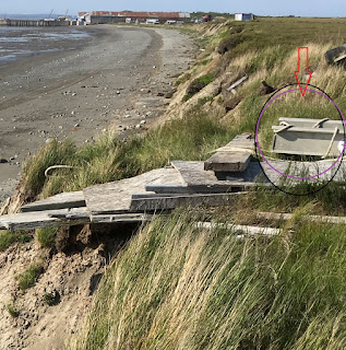 The cliff is much steeper than it was last year. It is almost a right angle with the beach right below the cabins. It didn’t make sense that it could have gotten higher, but we really didn’t want to pull the stairs down – all 35’ of them – and find that they no longer reached to the bottom. It would be hard to pull them back up. So we took a little time to measure the length of the stairs and the height of the cliff – without an actual tape measure, of course. We left the backpack with the keys to the cabin's porch at the bottom of the cliff in the truck. Since we decided to tie the top of the stairs to a screw anchor back in the tundra, we needed to retrieve the keys anyway to open Debby's cabin, where we store the lines. We thought it was important to tie to top of the stairs to the top of the cliff so that if the cliff did somehow get higher, or the beach got lower, the whole set of stairs wouldn’t end up on the beach, horizontally.